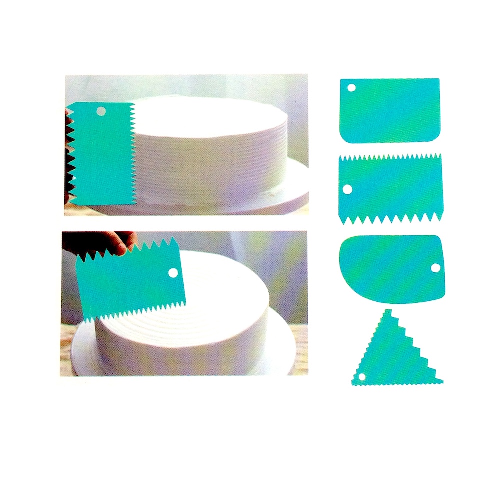 И так, вы получите четыре кондитерских скребка, изготовленных из пищевого пластика. Прямоугольный с ровными краями, зубчатый и с округлыми краями и четвёртый треуголной формы - в подарок.