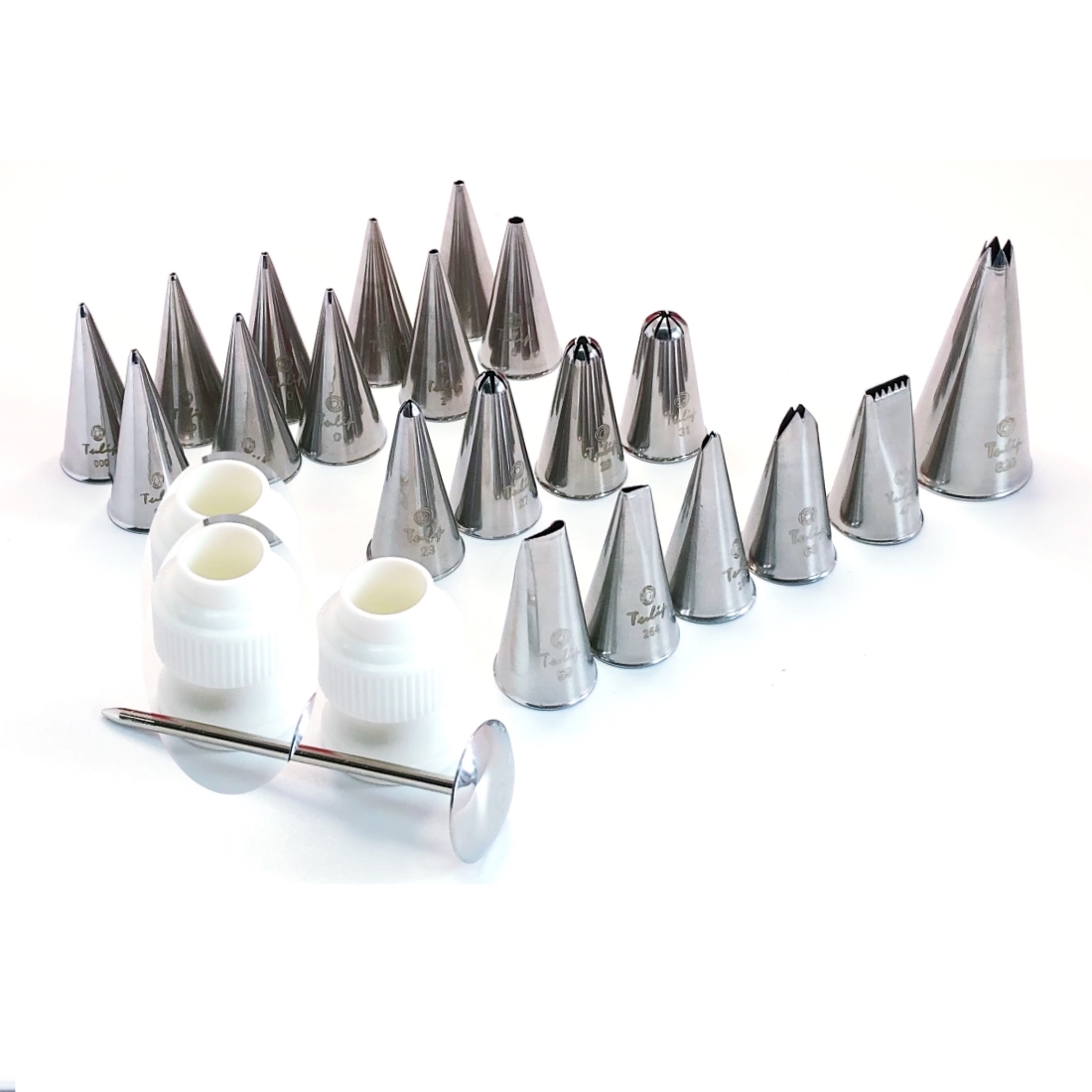 Кондитерские насадки в наборе маркированы номером и лого Ateco или Tulip, сделаны в Корее и имеют гарантию качества 10 лет.